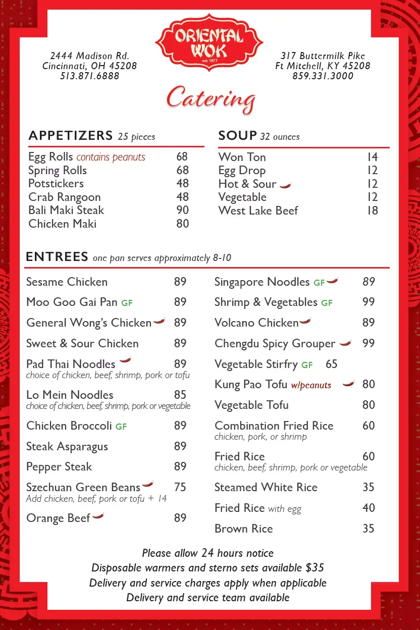 Oriental Wok is the preferred caterer for The Cincinnati Reds, Mercedes-Benz, Children’s Hospital, UC Medical Center, KMK Law, The Cincinnati Chinese Chamber of Commerce, and Marsh Brands!
